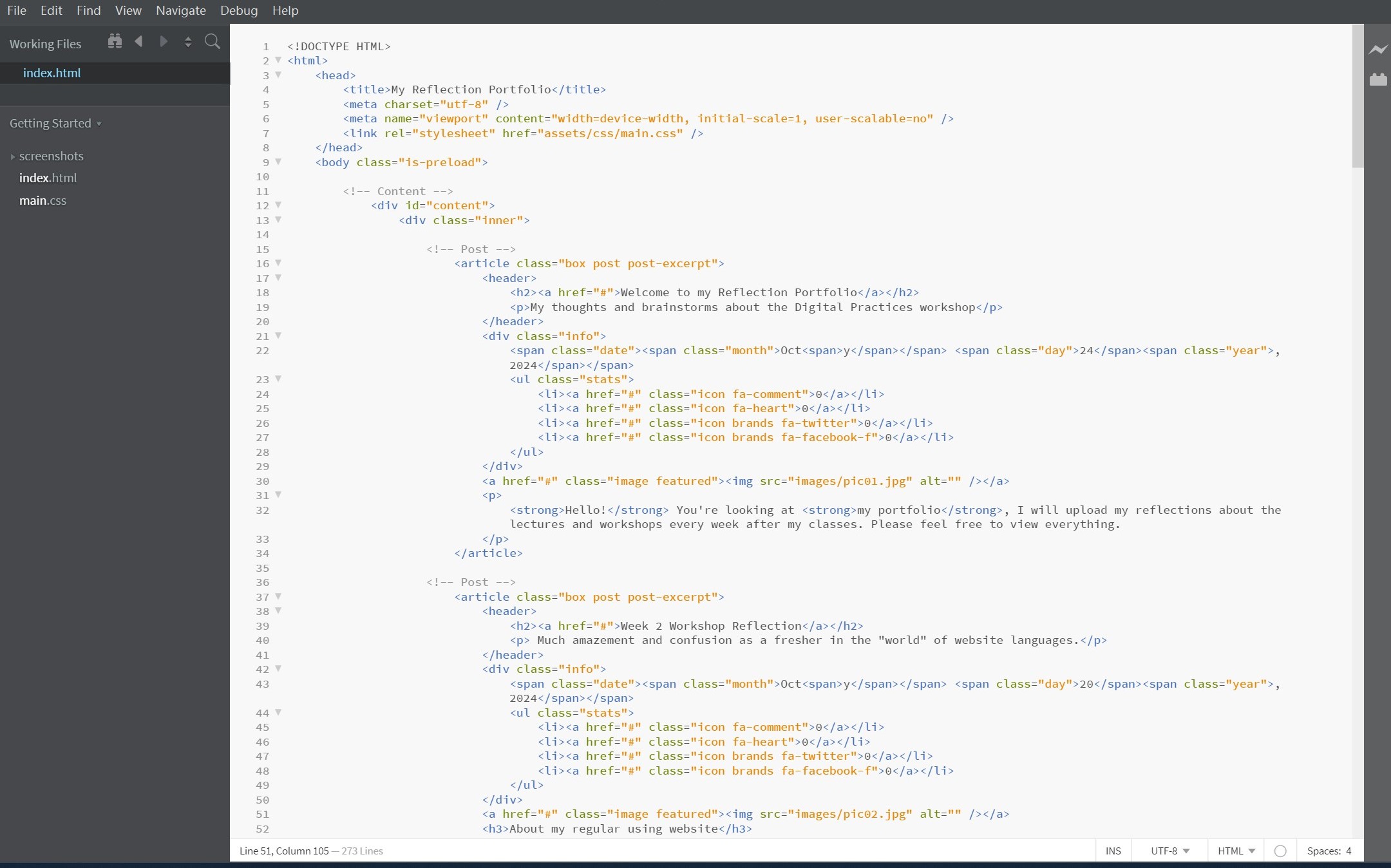 Before I got into digital practices, I'd never come across web languages or anything to do with websites. HTML and CSS were completely new to me, but they weren't at all difficult to understand. When I turned on developer tools in class to look at web pages that I thought were pretty simple, I have to say that HTML and CSS are far more complex than I thought.